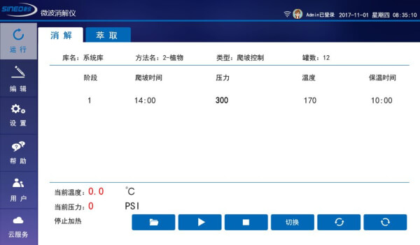 TANK PLUS使用ucos+安卓操作系統(tǒng) 運(yùn)行穩(wěn)定可靠,采用7寸液晶彩色觸摸屏,觸控操作流暢簡(jiǎn)便。頁(yè)面實(shí)時(shí)顯示工作狀態(tài)及溫壓變化曲線。內(nèi)置專家方法庫(kù),可自行編輯及存儲(chǔ)用戶方法,也可以從云服務(wù)方法庫(kù)下載其他共享方法。內(nèi)置COT實(shí)時(shí)溫壓異常監(jiān)控系統(tǒng)能夠在任何一個(gè)反應(yīng)罐出現(xiàn)溫壓異常時(shí)自動(dòng)報(bào)警并切斷微波從而保護(hù)儀器安全。裝有內(nèi)部攝像頭可實(shí)時(shí)監(jiān)控爐腔內(nèi)消解罐運(yùn)行情況。